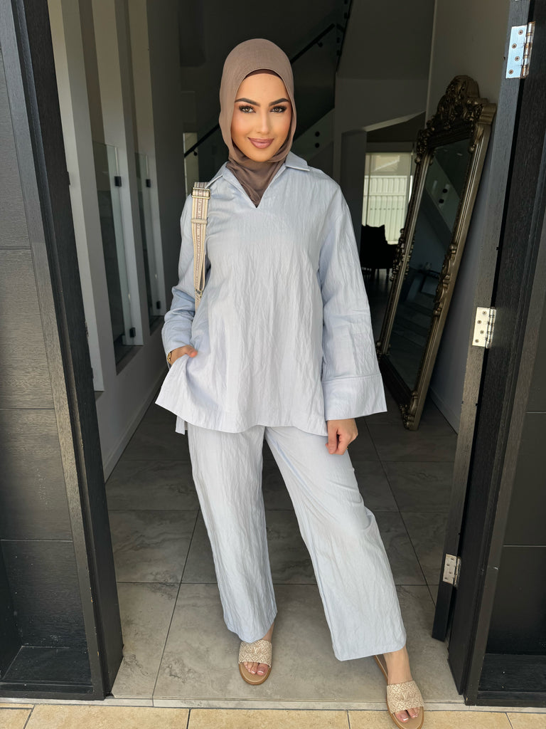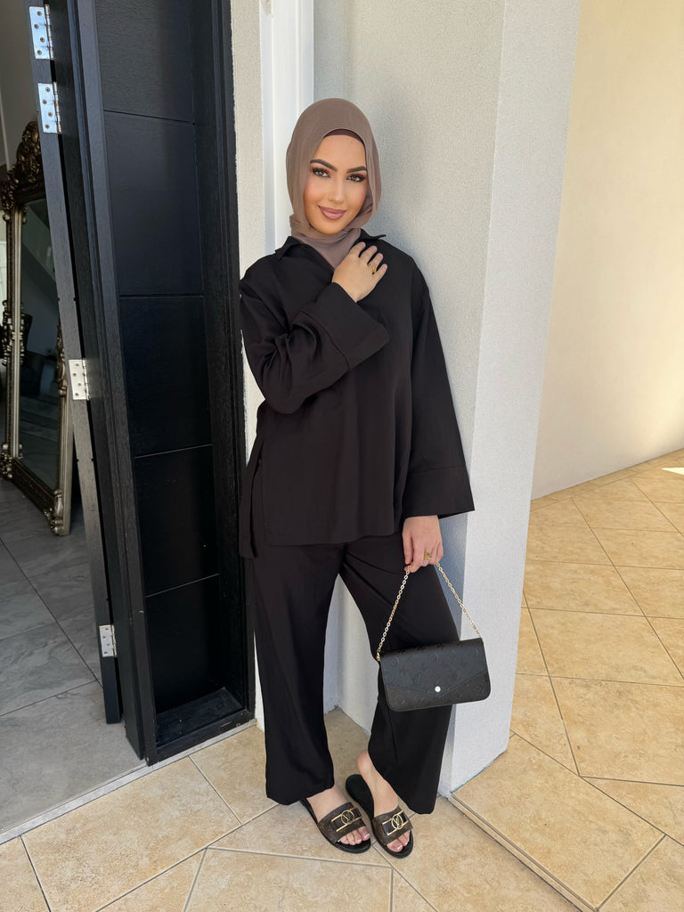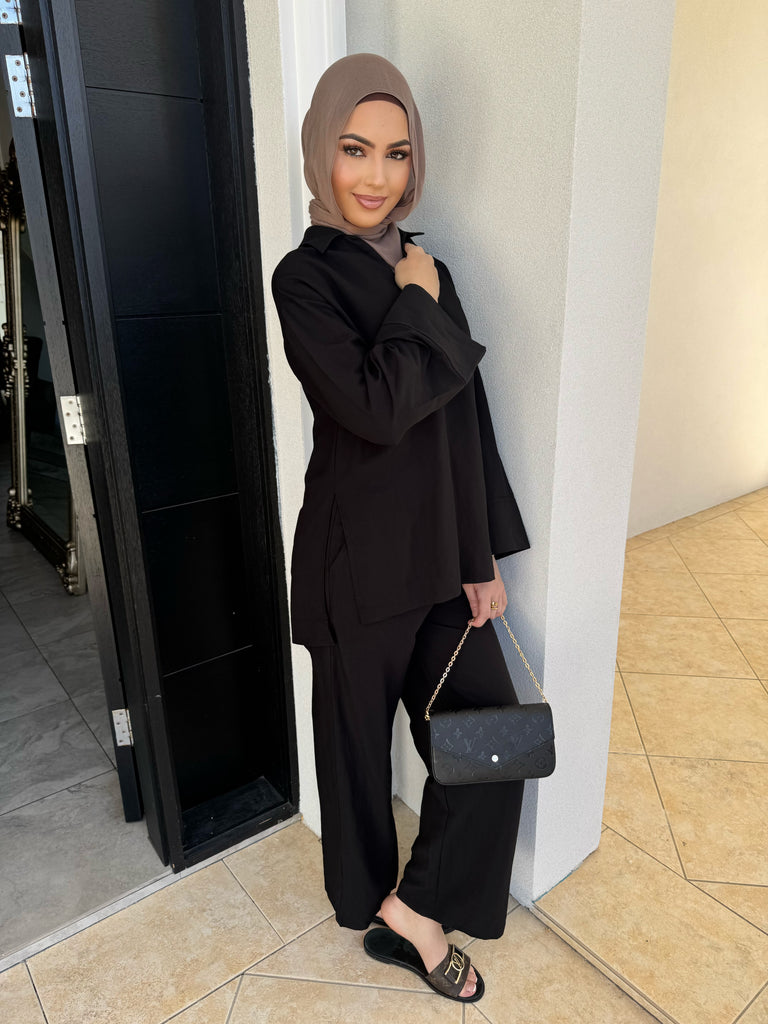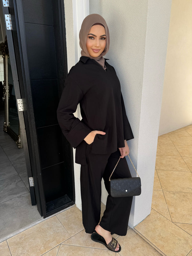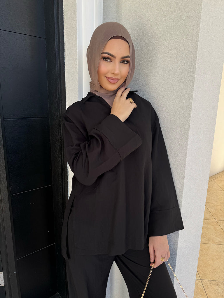 features a collar and split sides