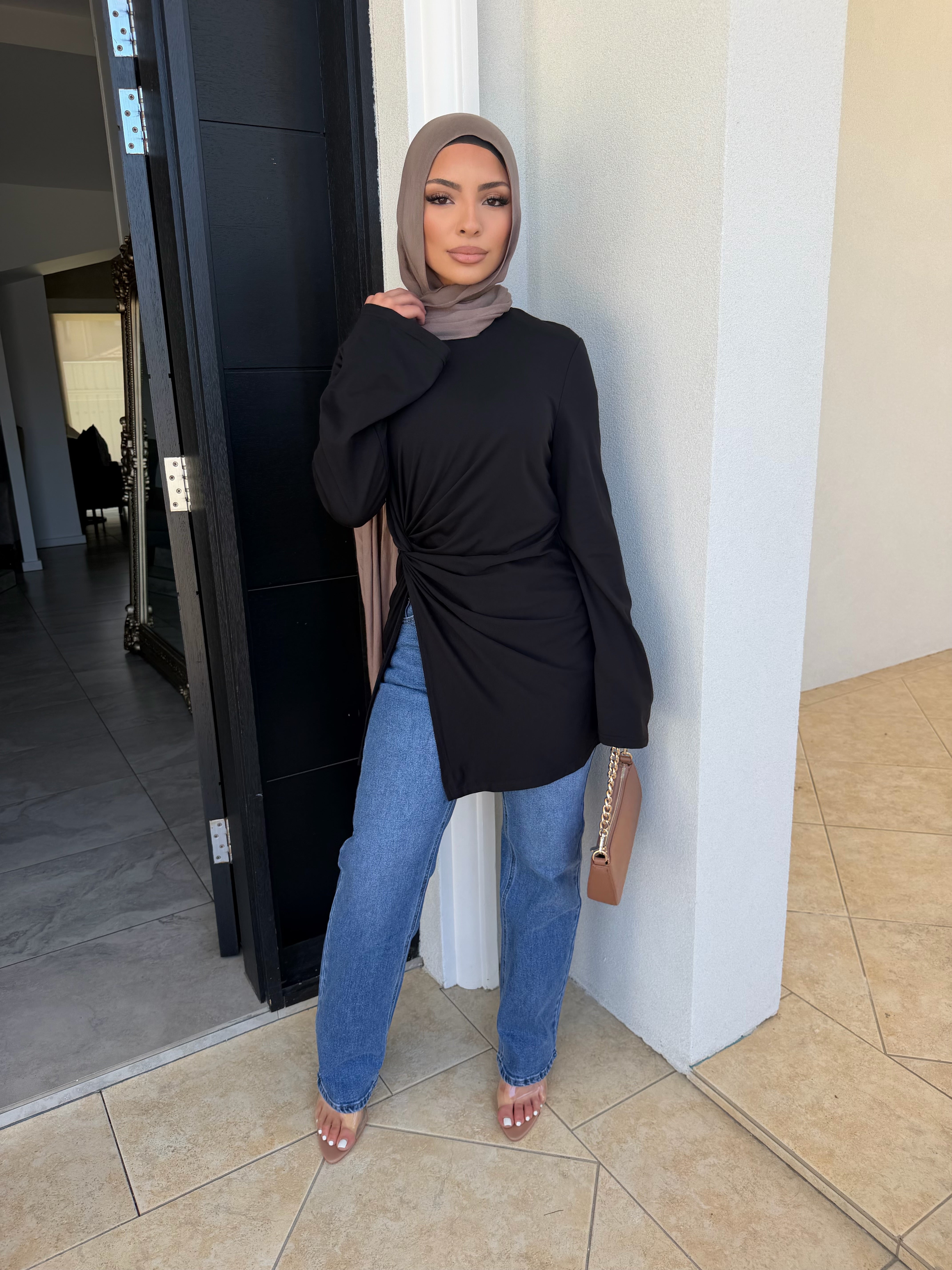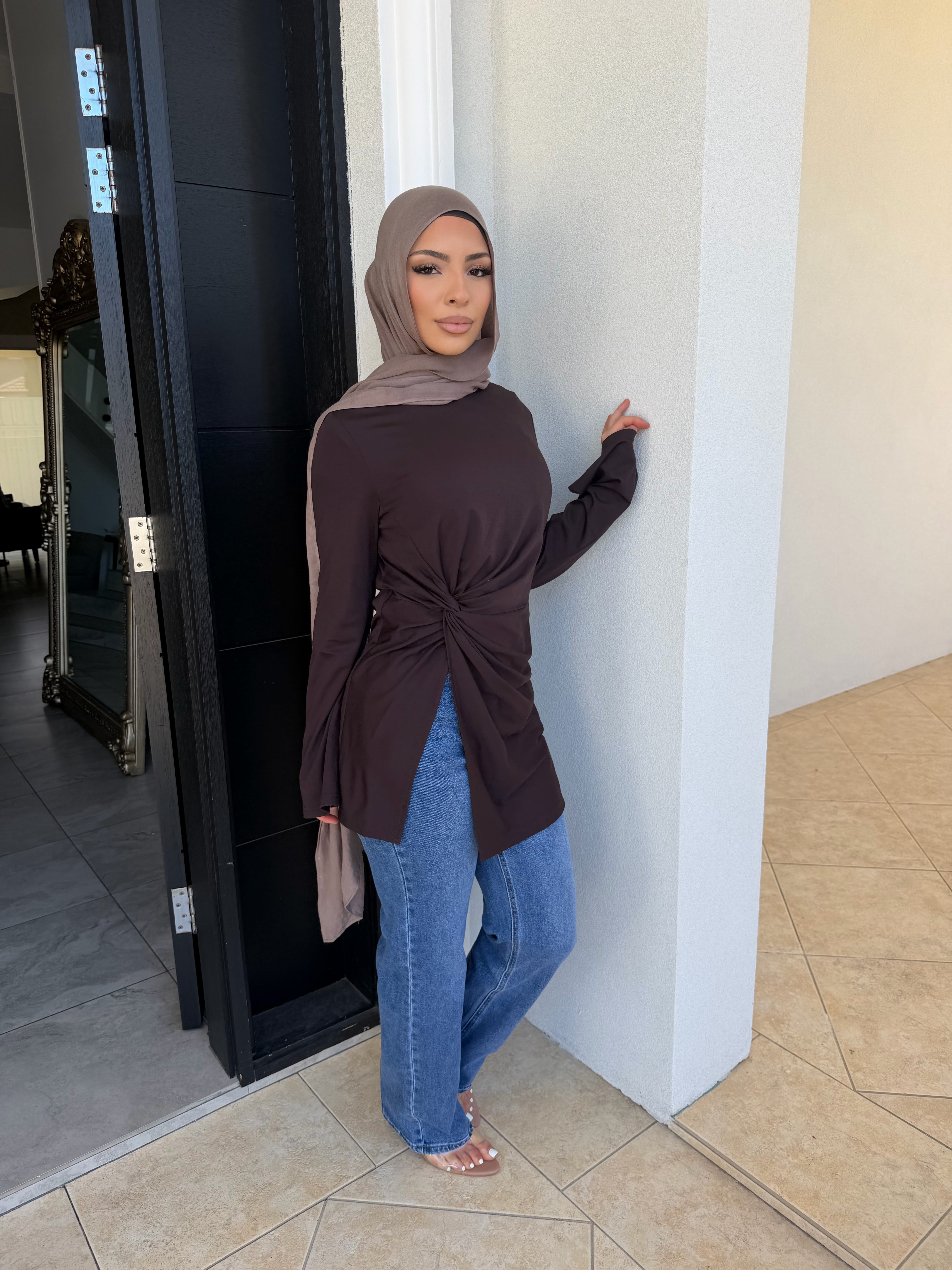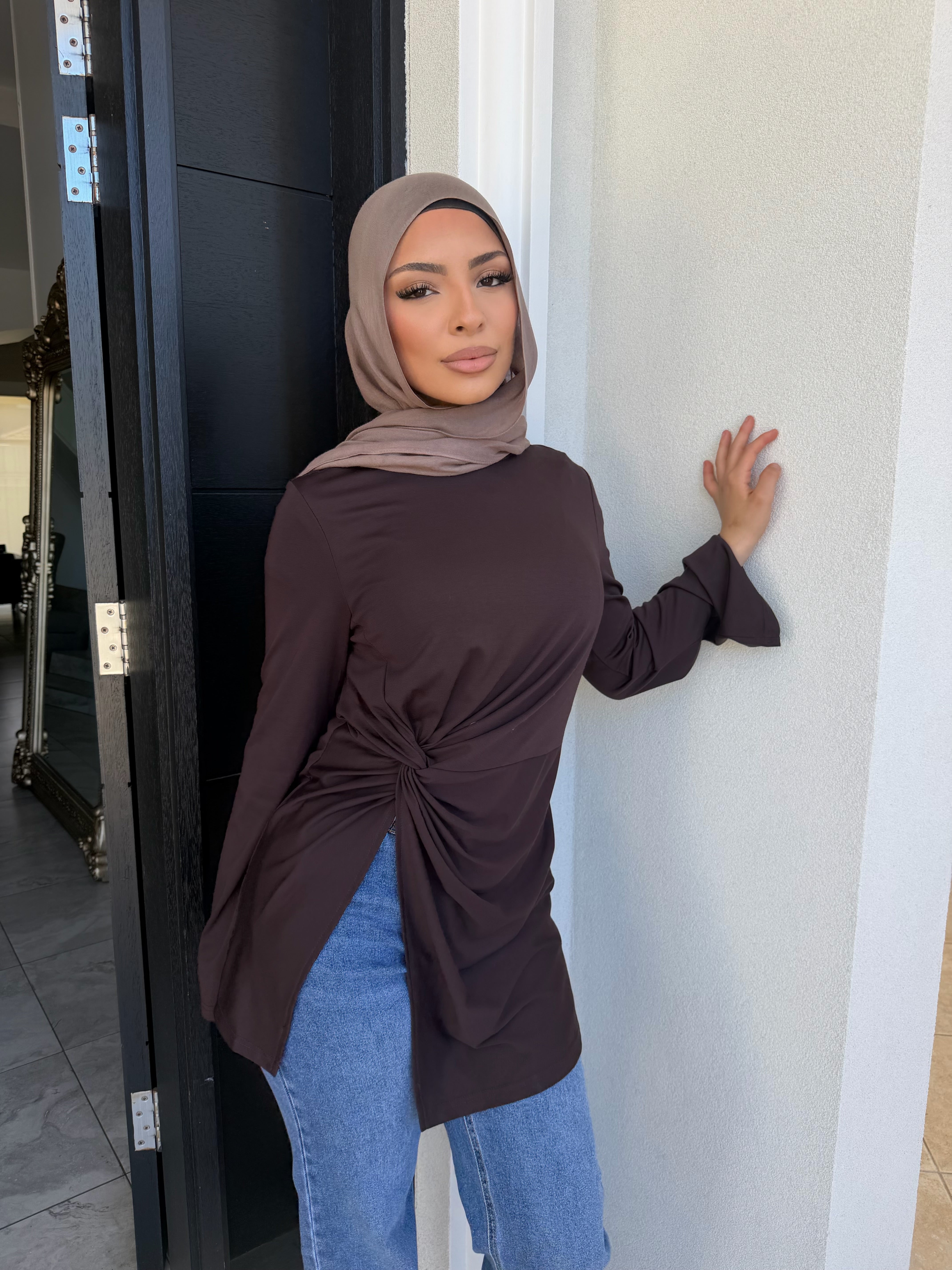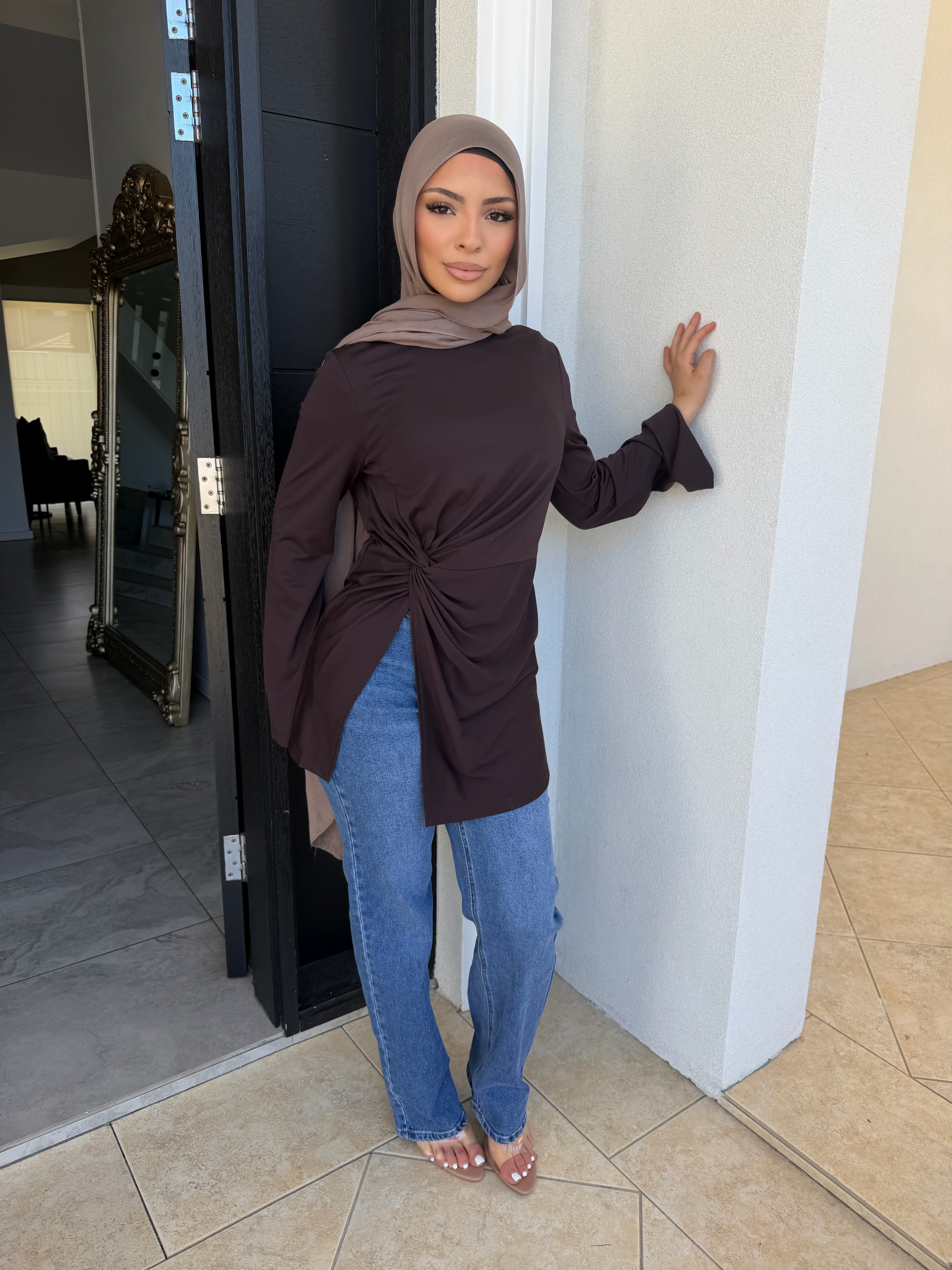 Stretch light ponte knot top with split