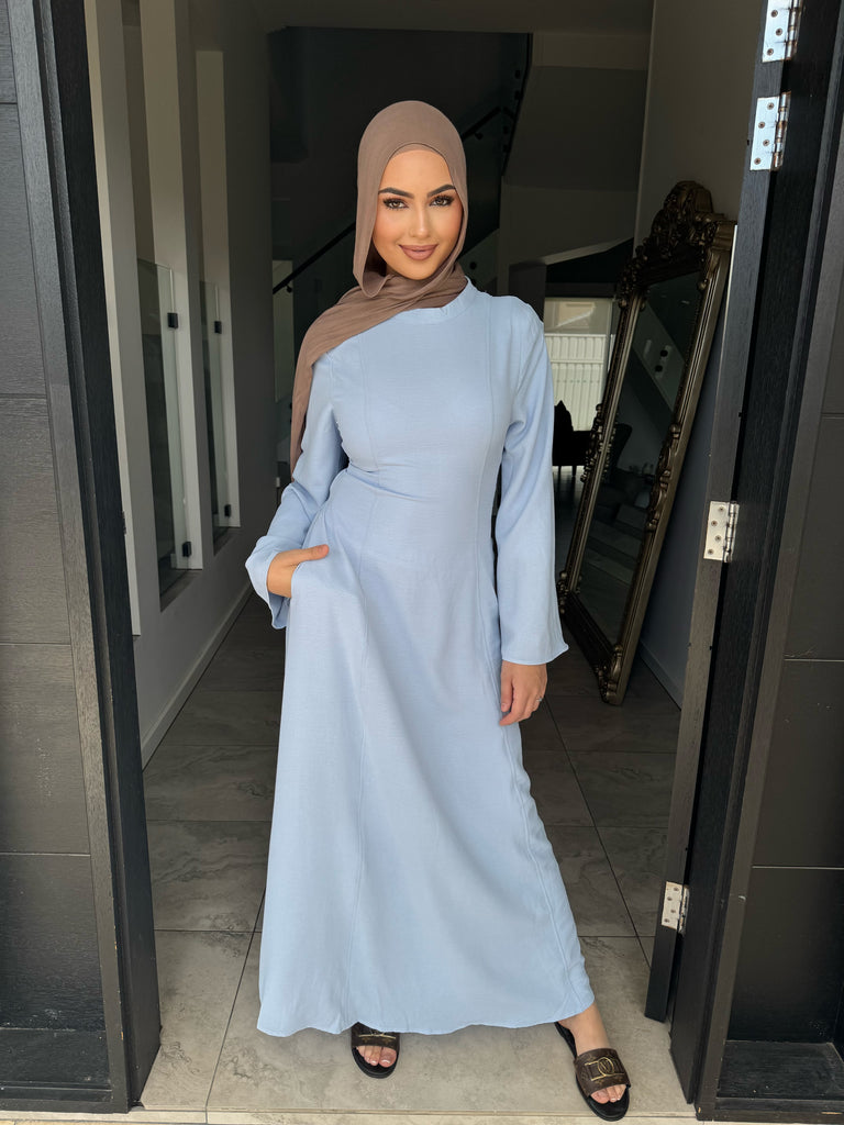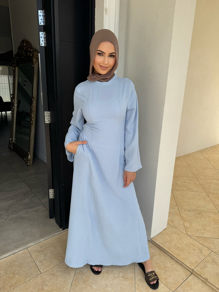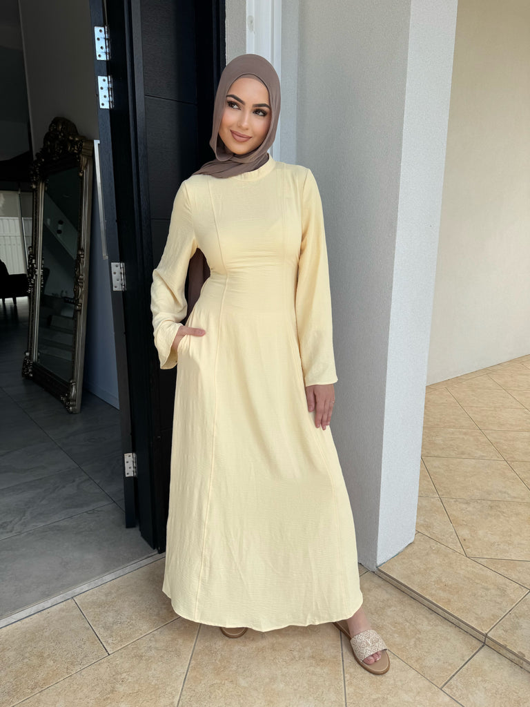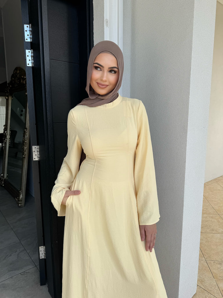 This extravagant panel dress, features a high neck, pockets and a belle sleeve.