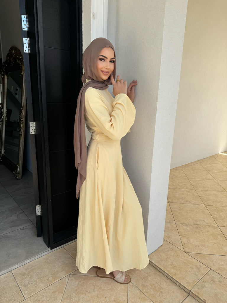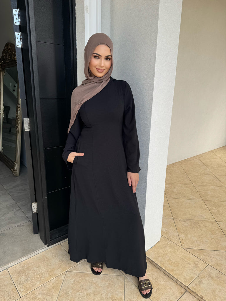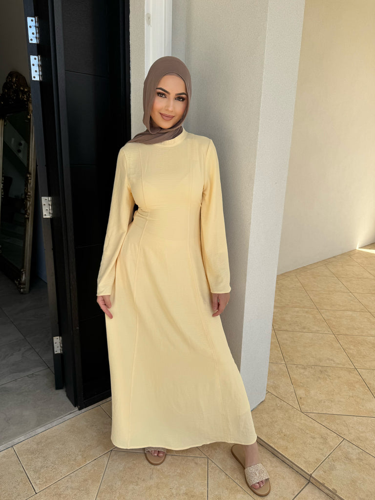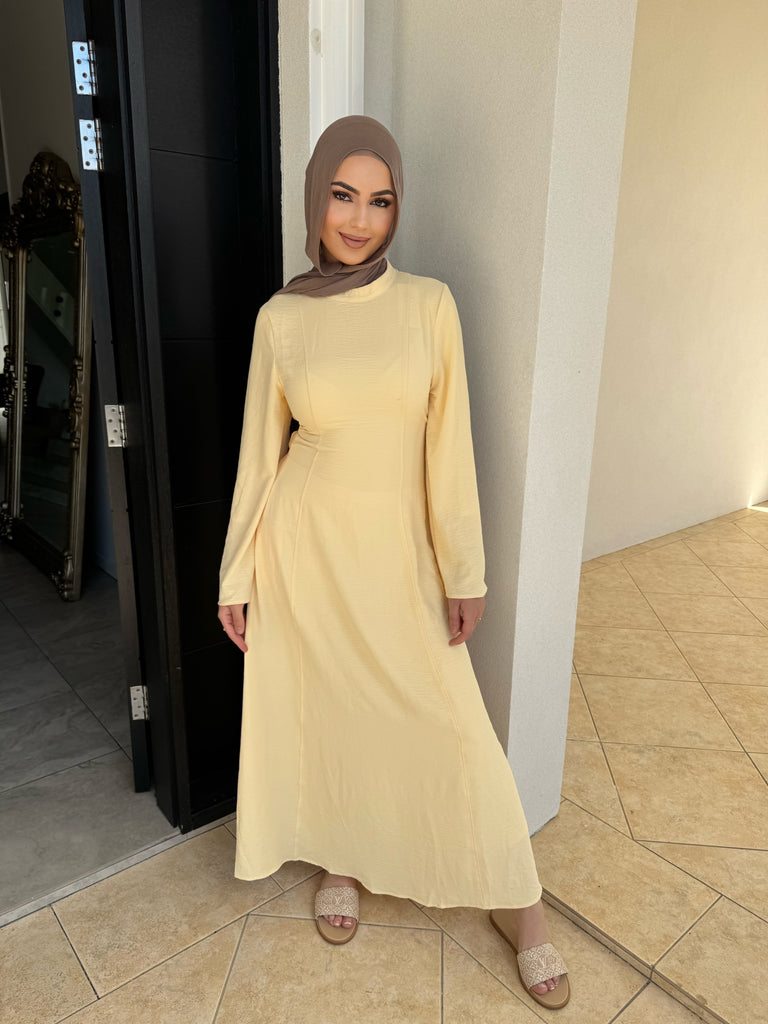 This extravagant panel dress, features a high neck, pockets and a belle sleeve.