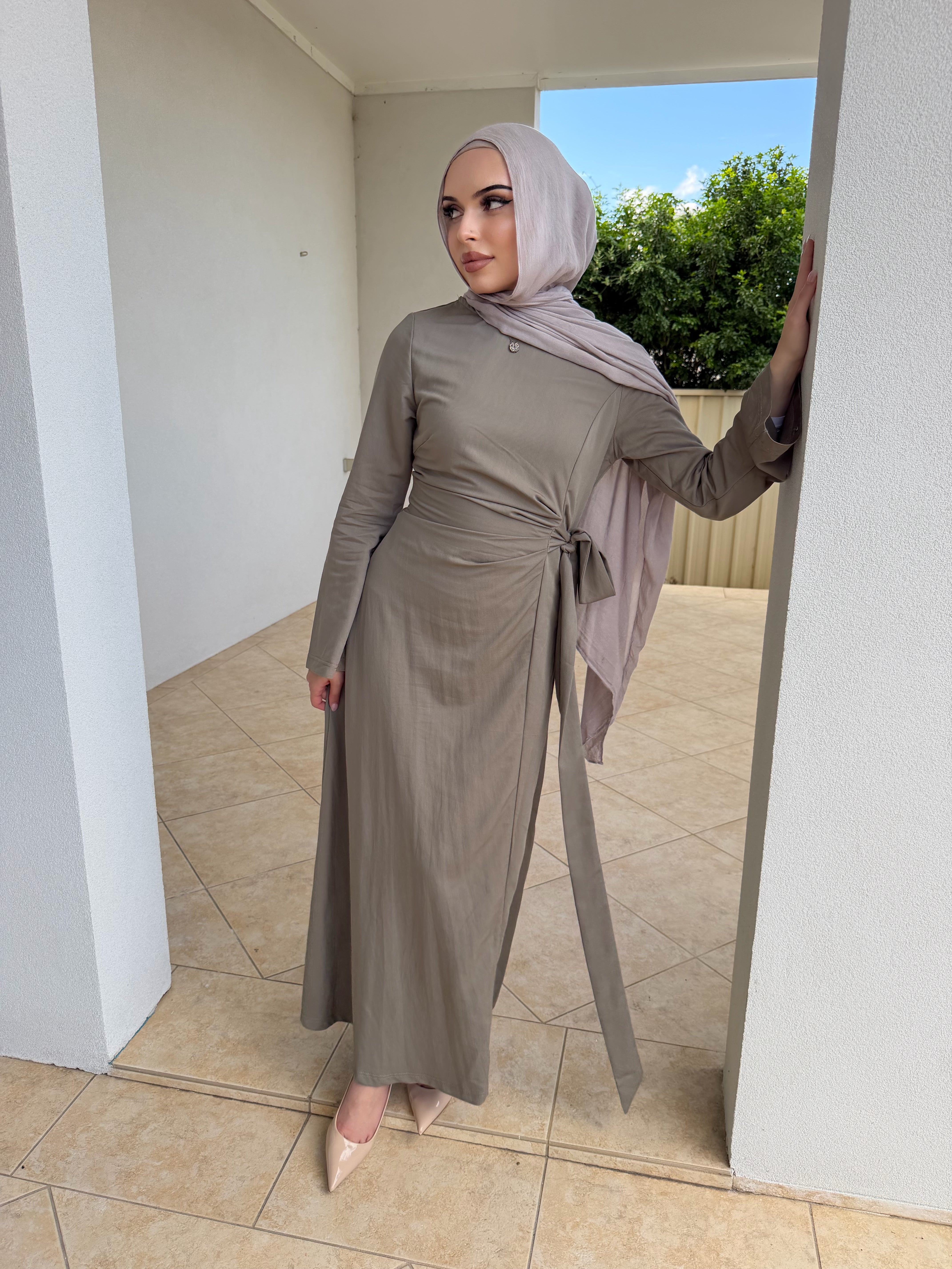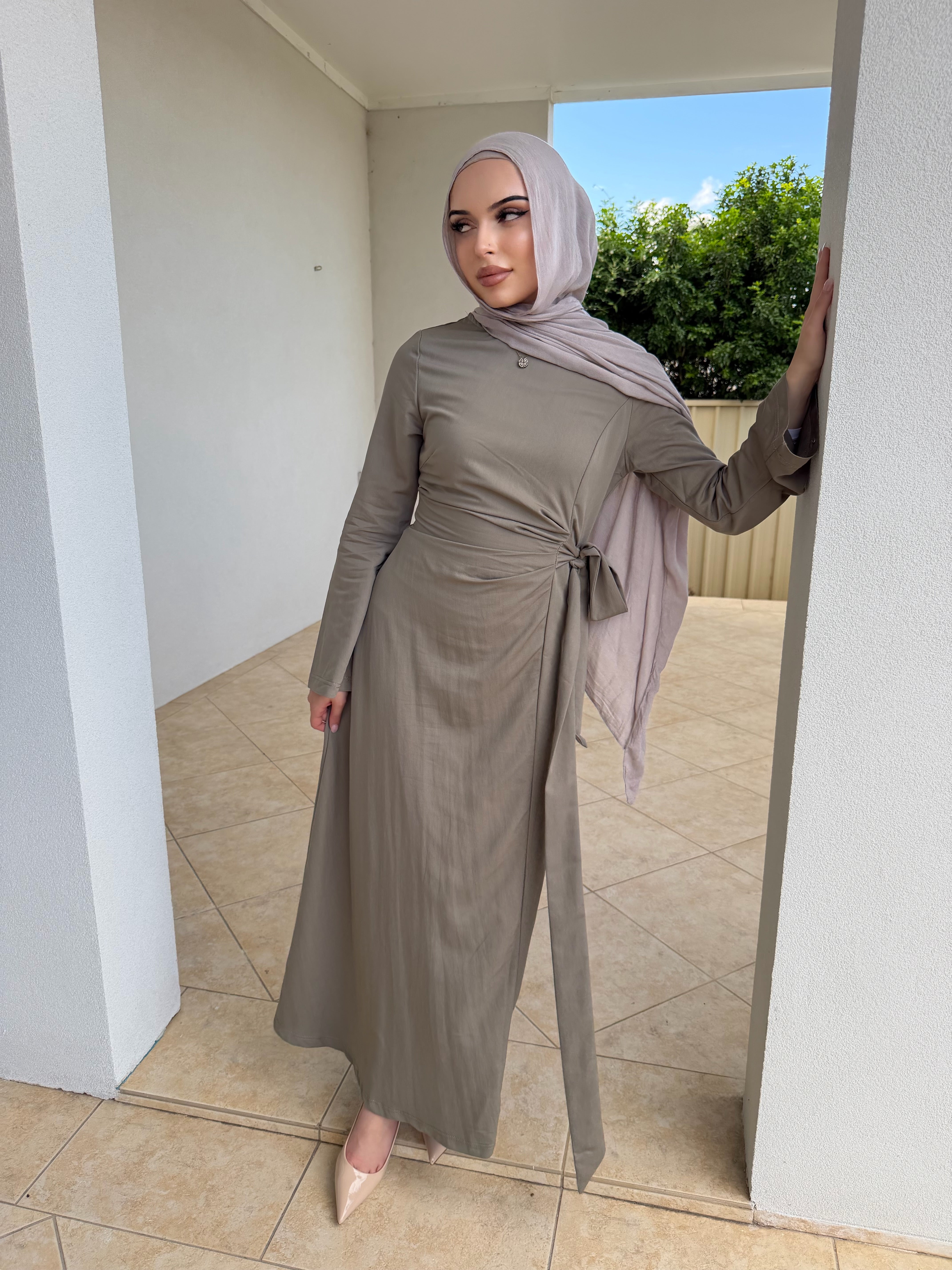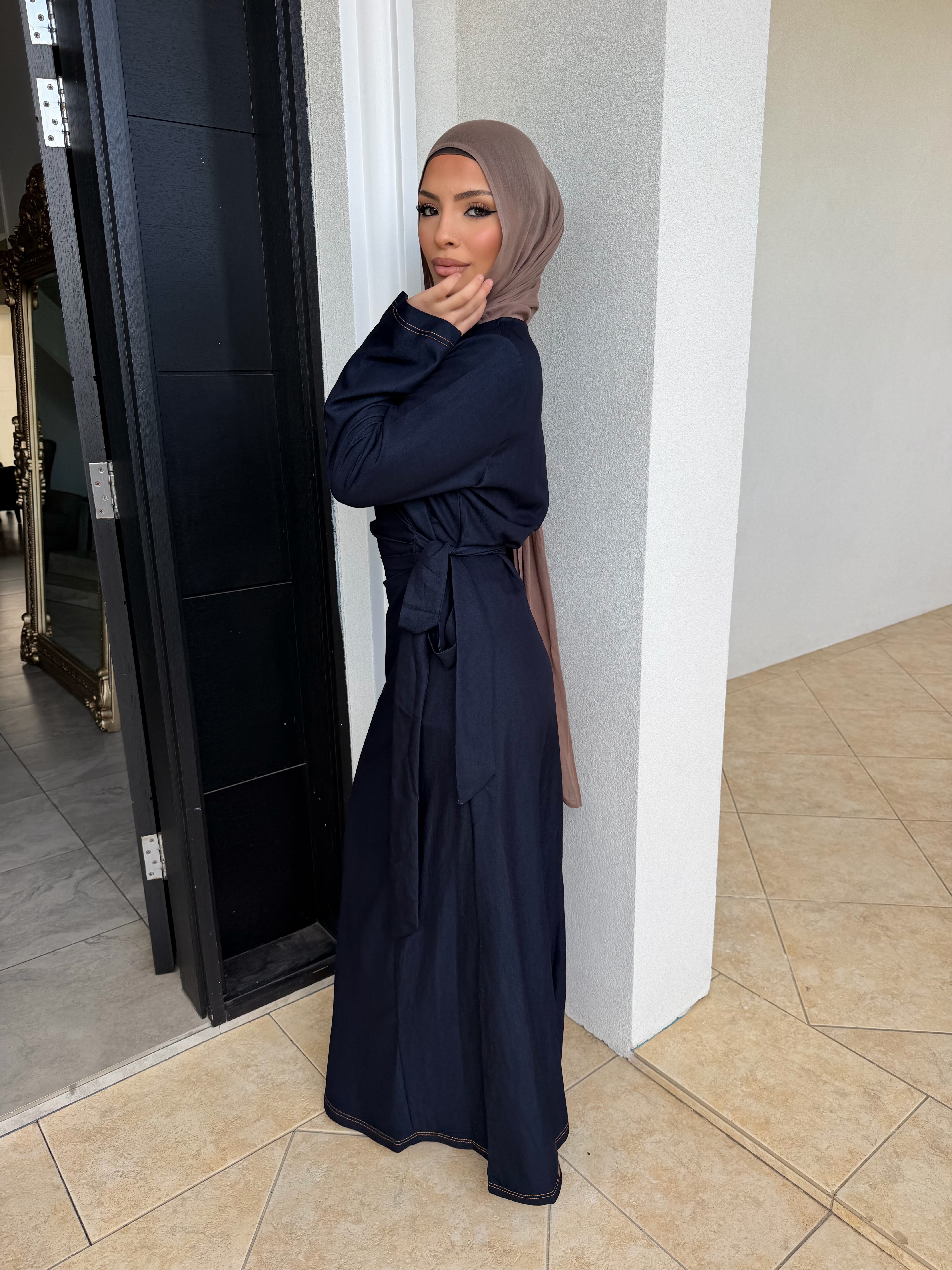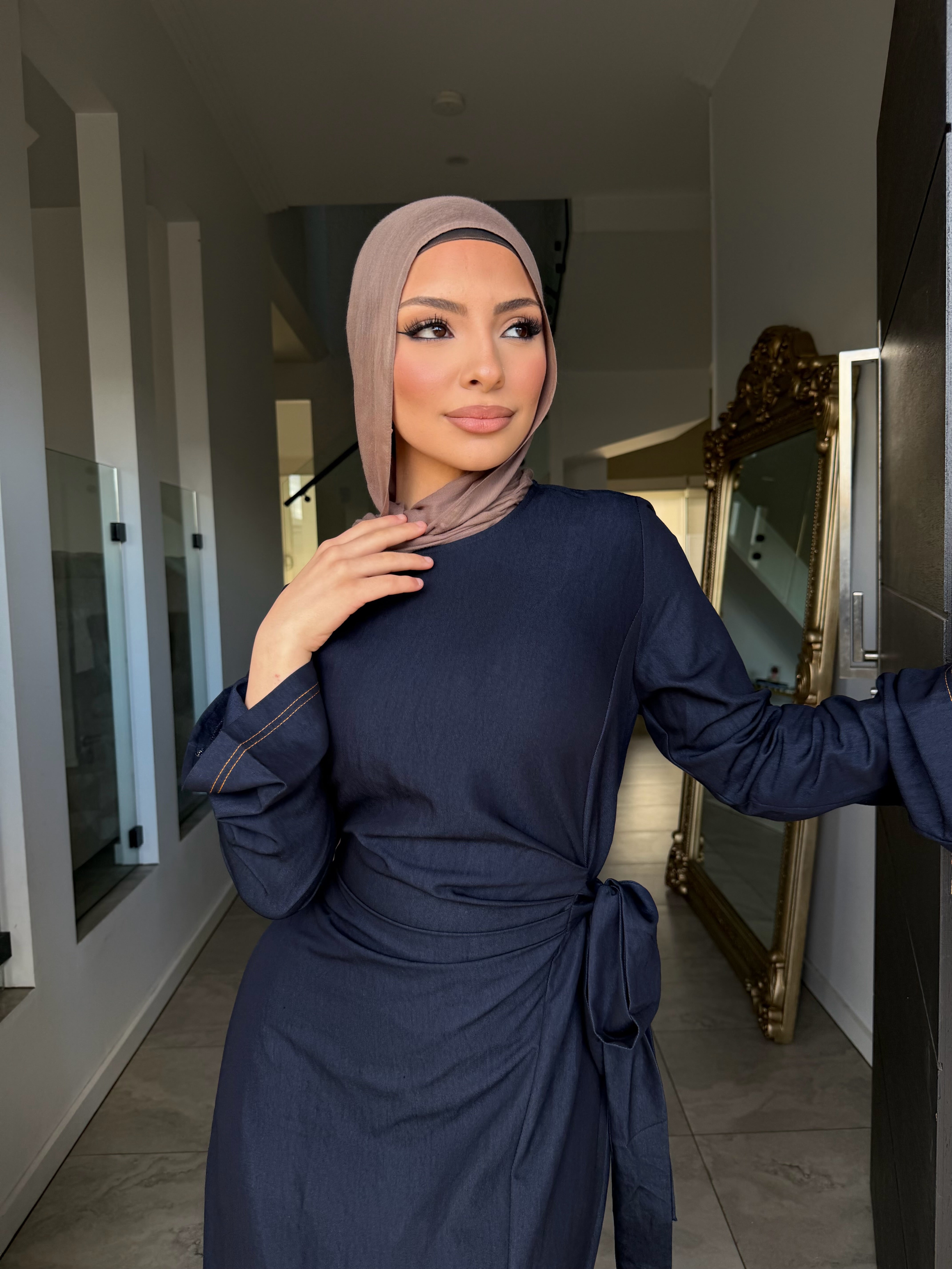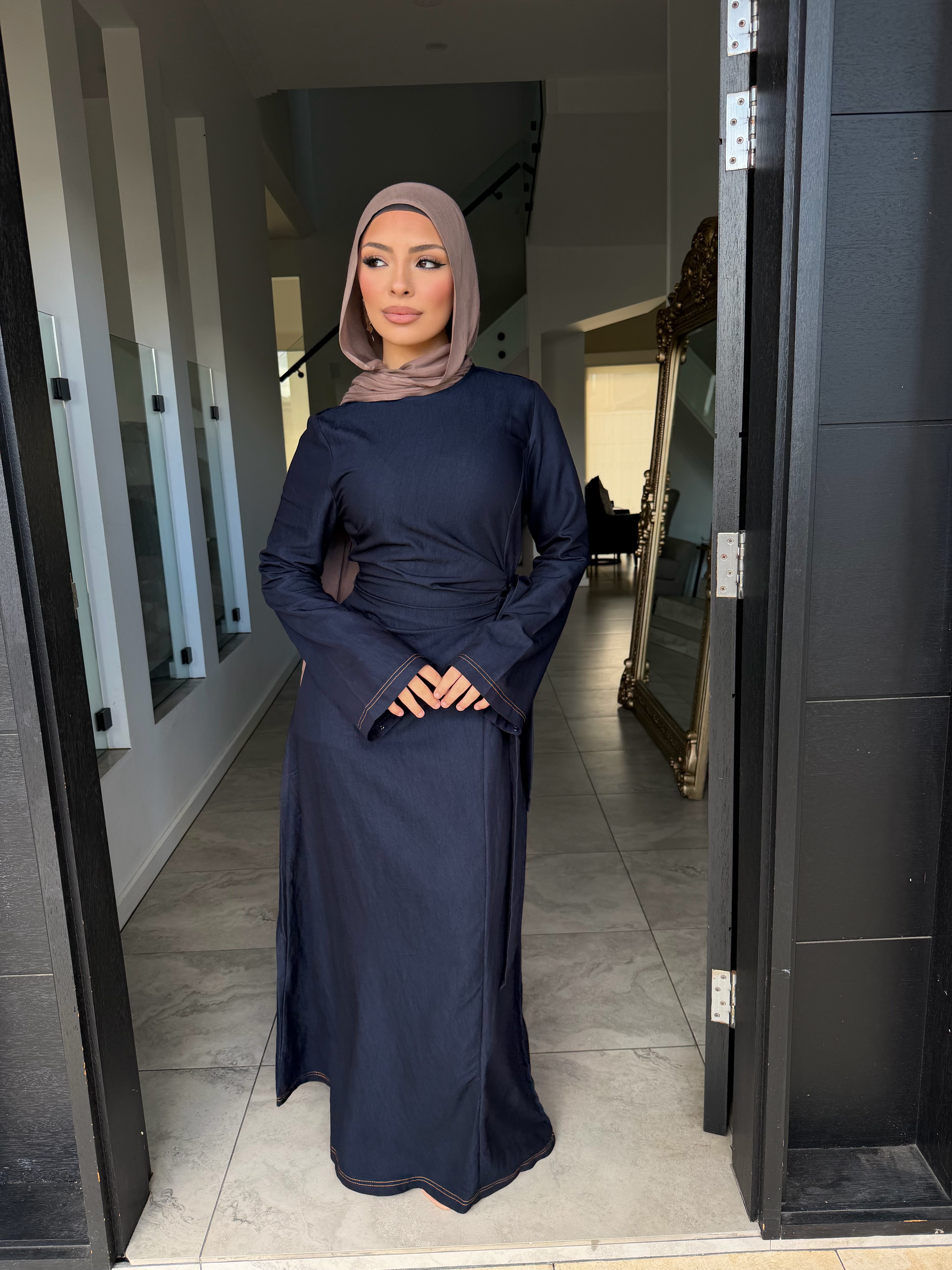 Denim tensile dress with ruched front and tie zipper at rear
