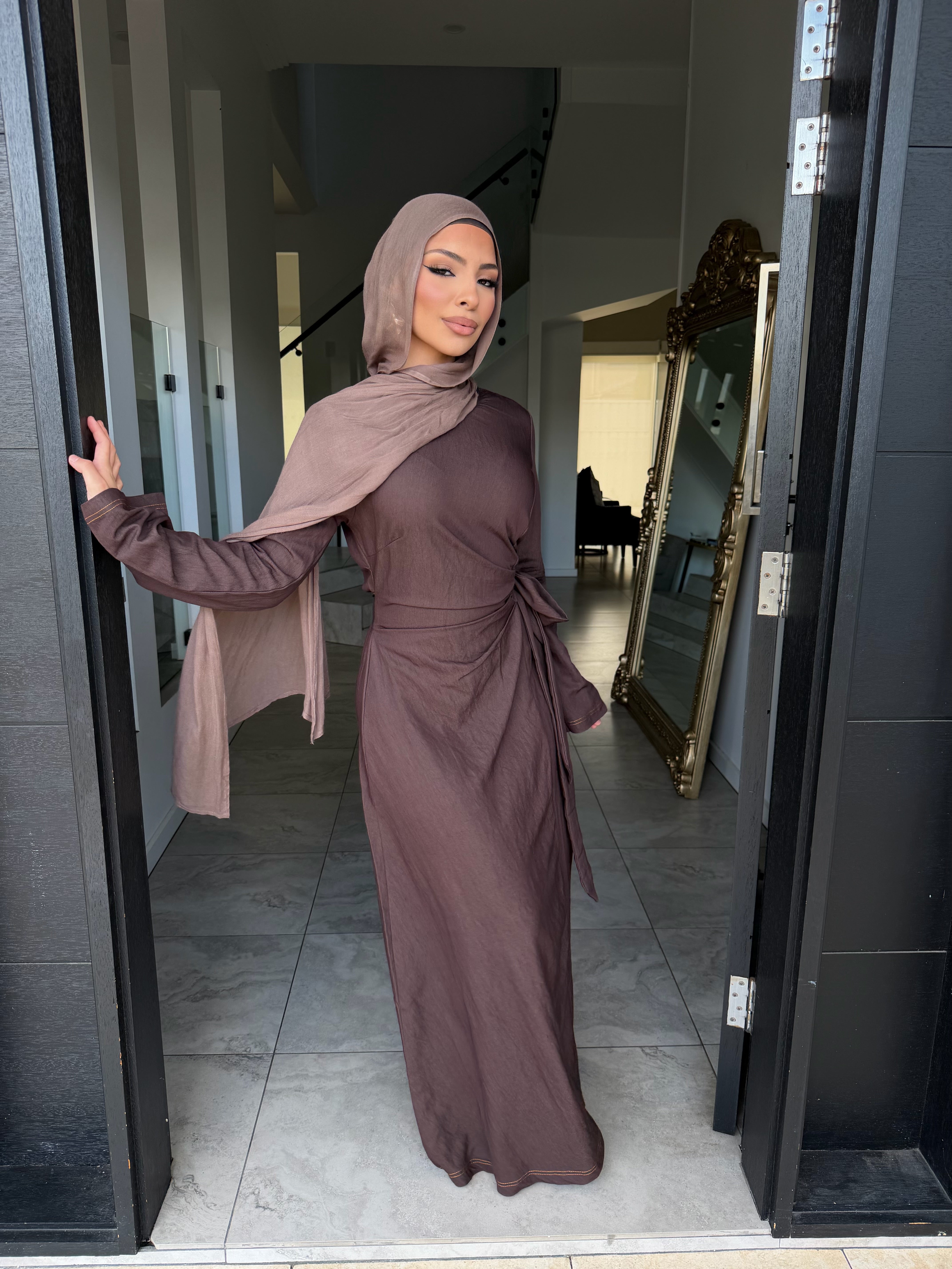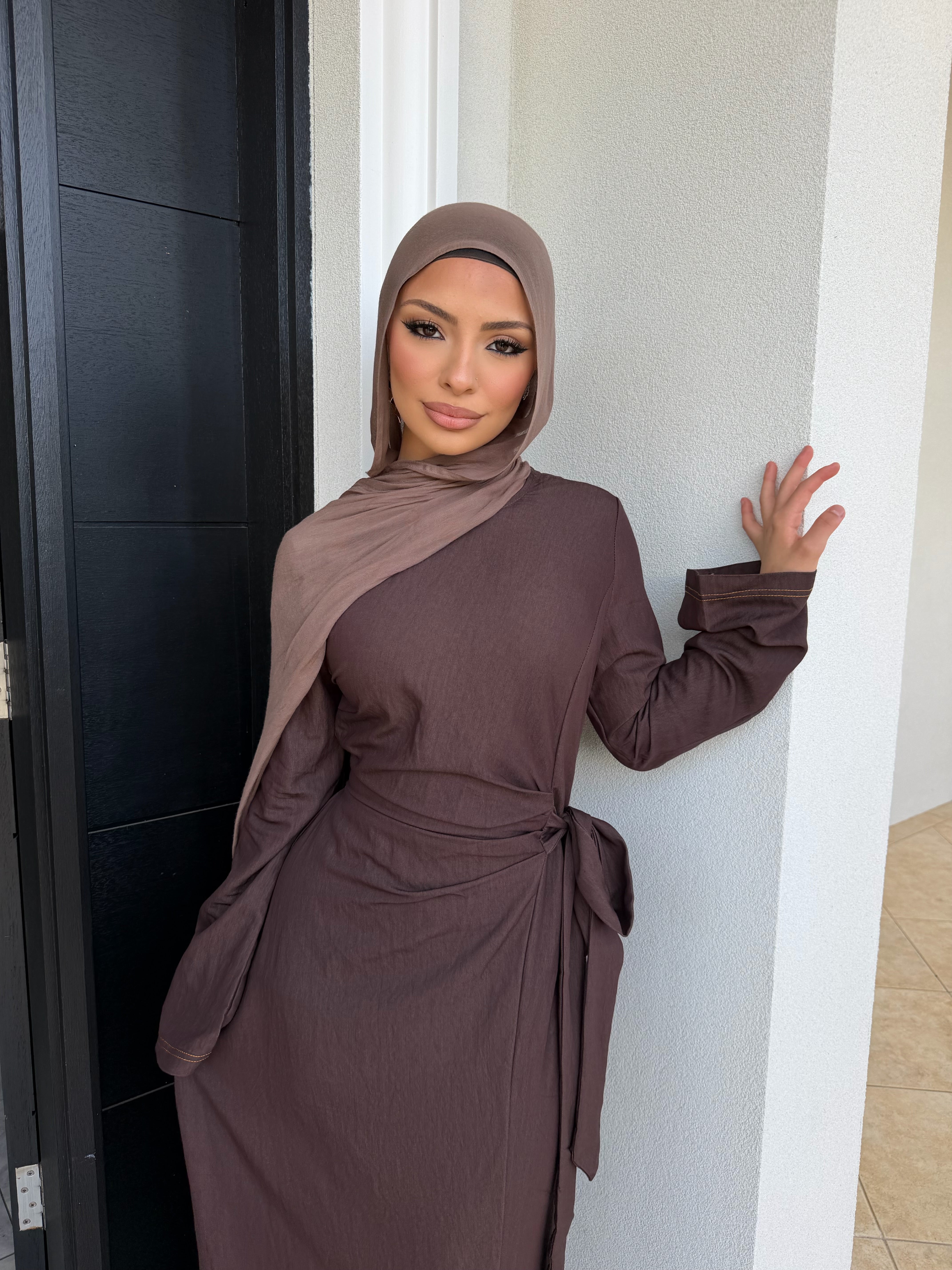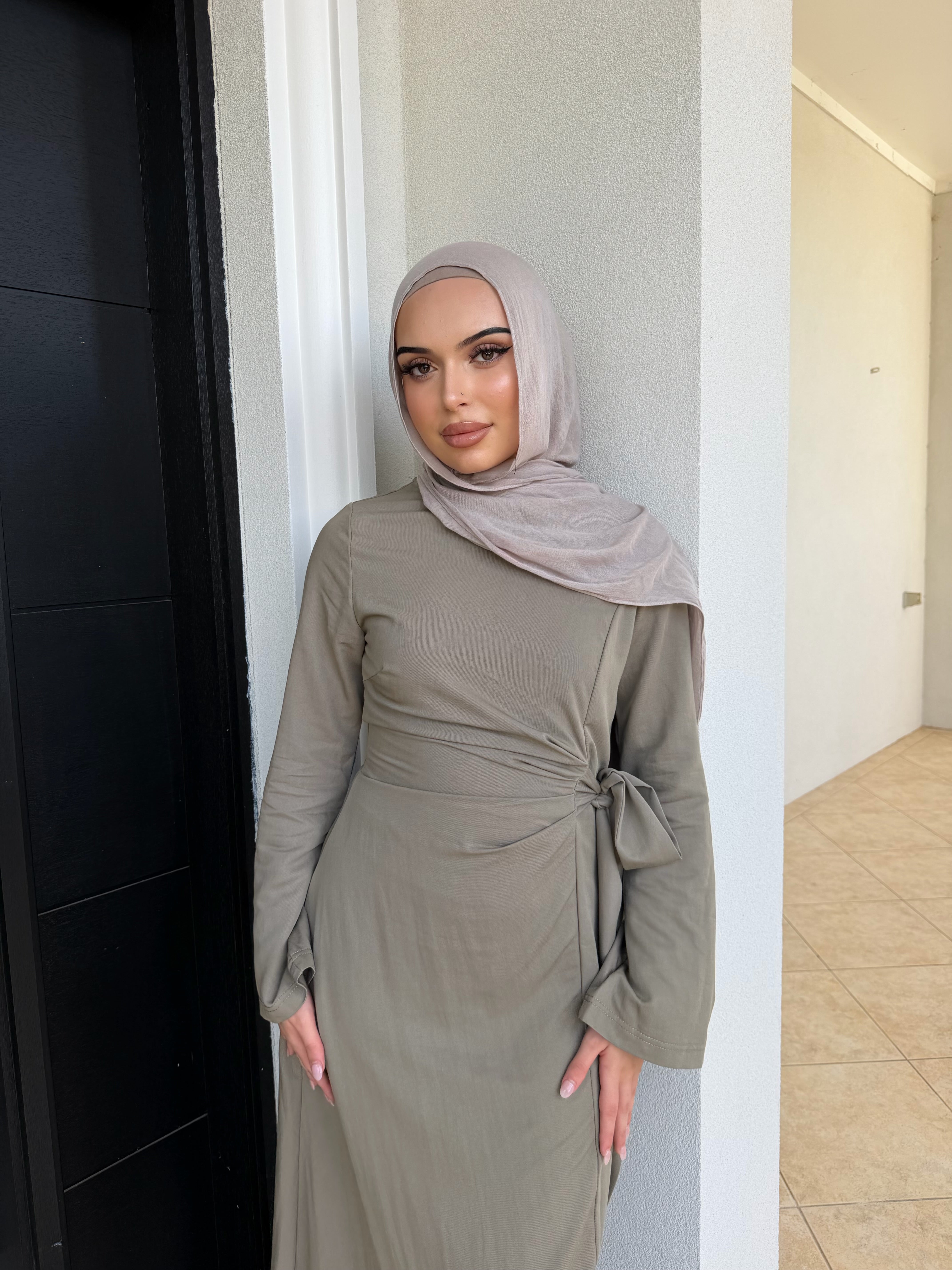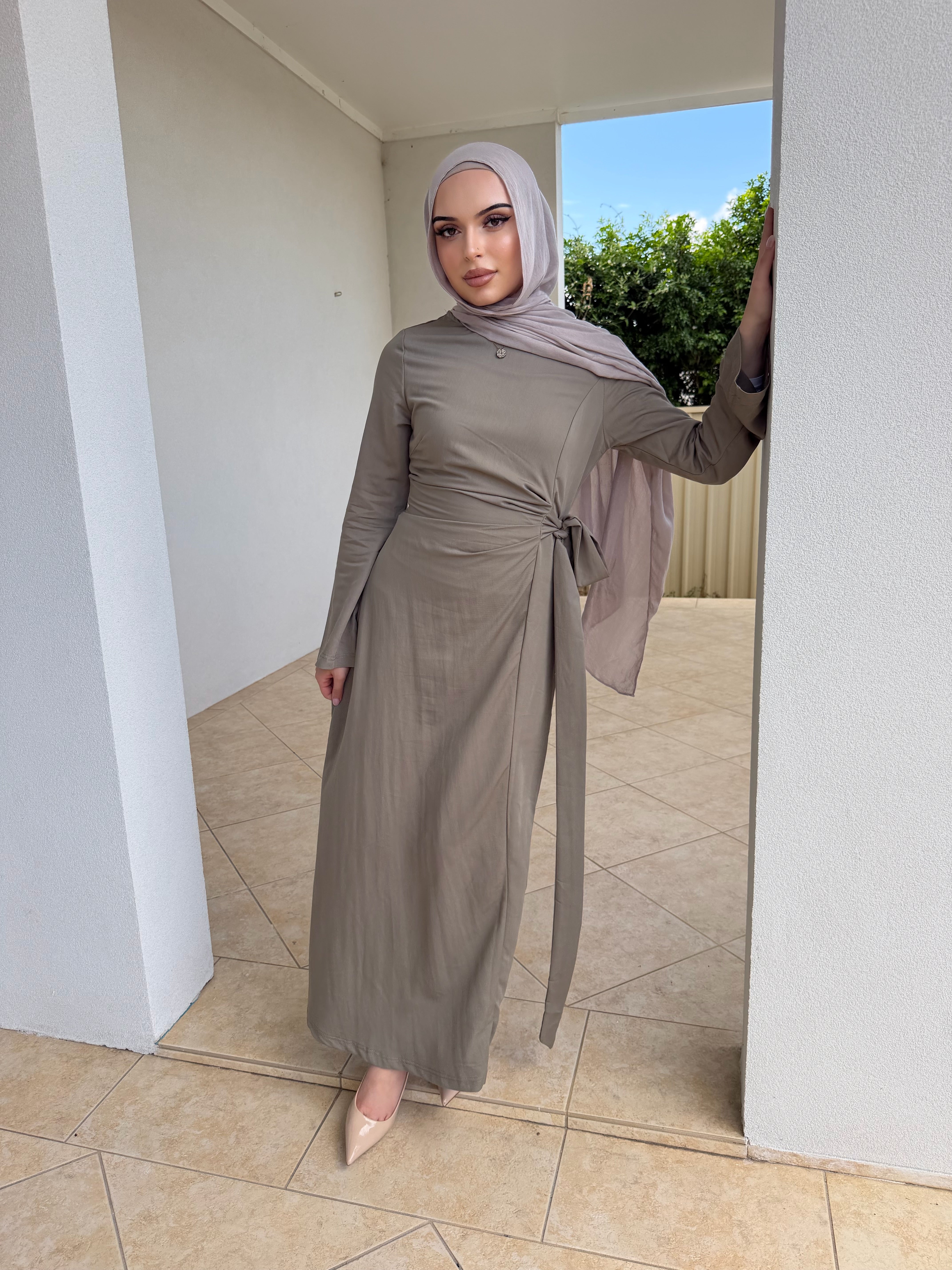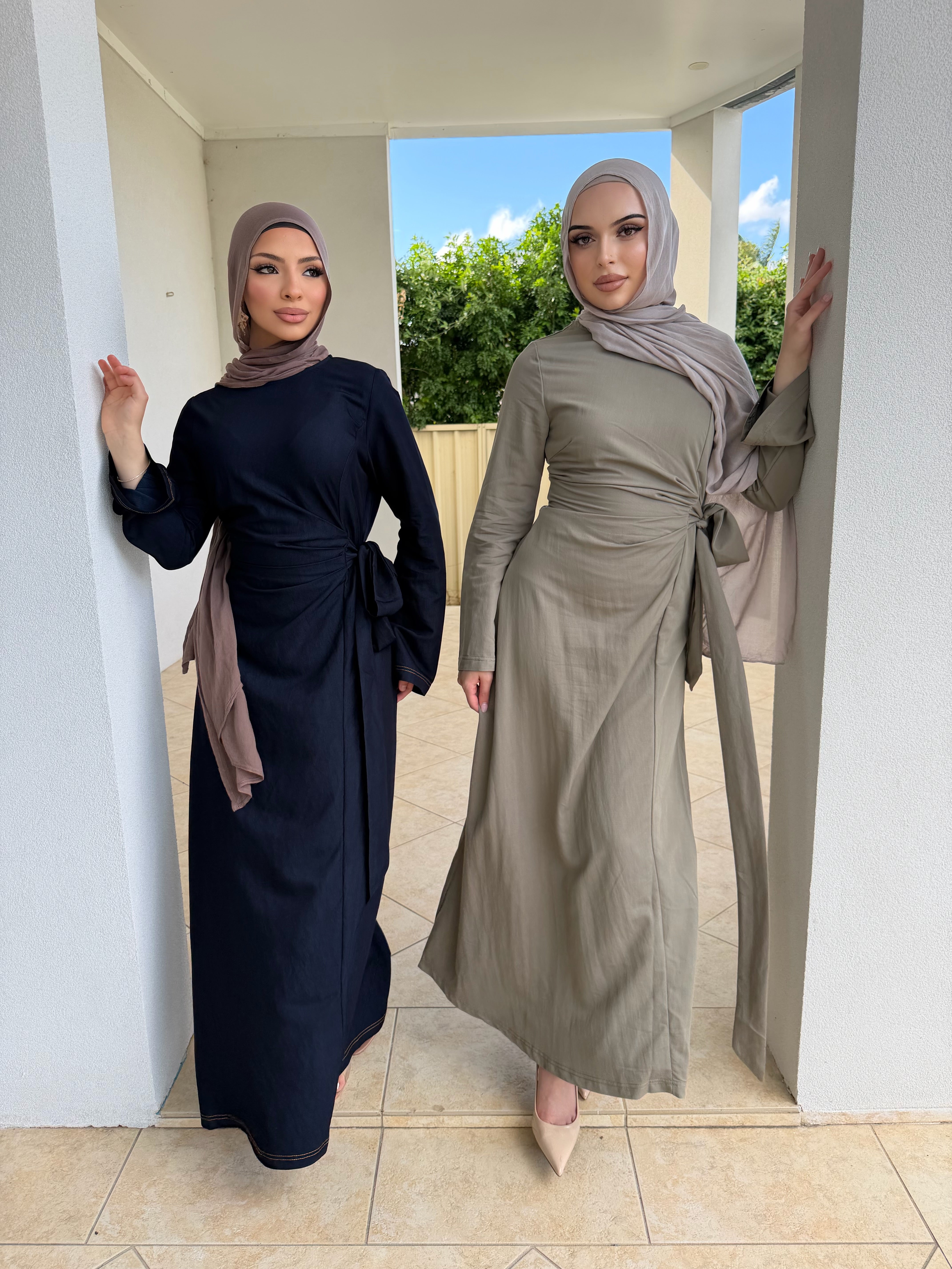 Denim tensile dress with ruched front and tie zipper at rear